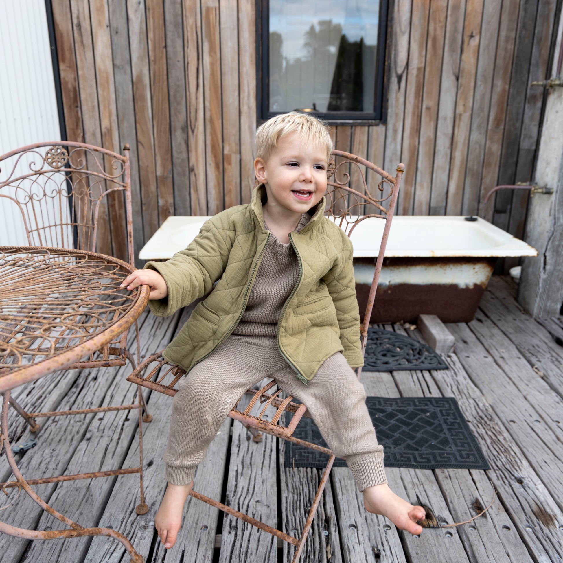Pictured is layered with our quilted green jacket.