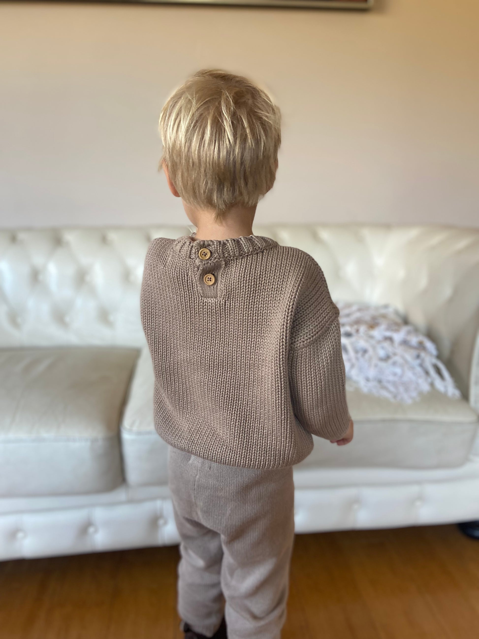 Our chunky knit pullover features 3 buttons at the back for easy dressing. It is made from GOTS organic cotton and the quality and softness is second to none.
