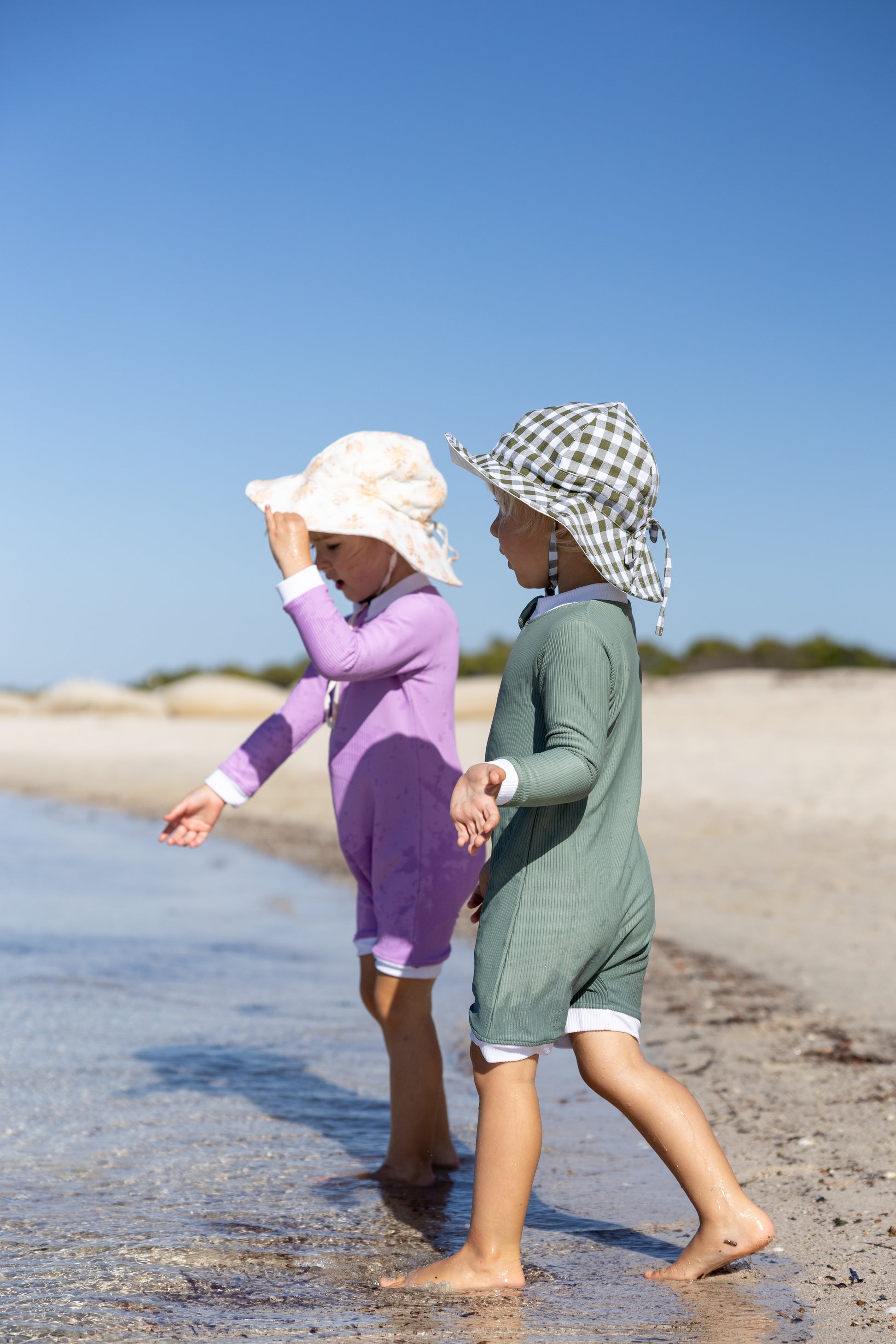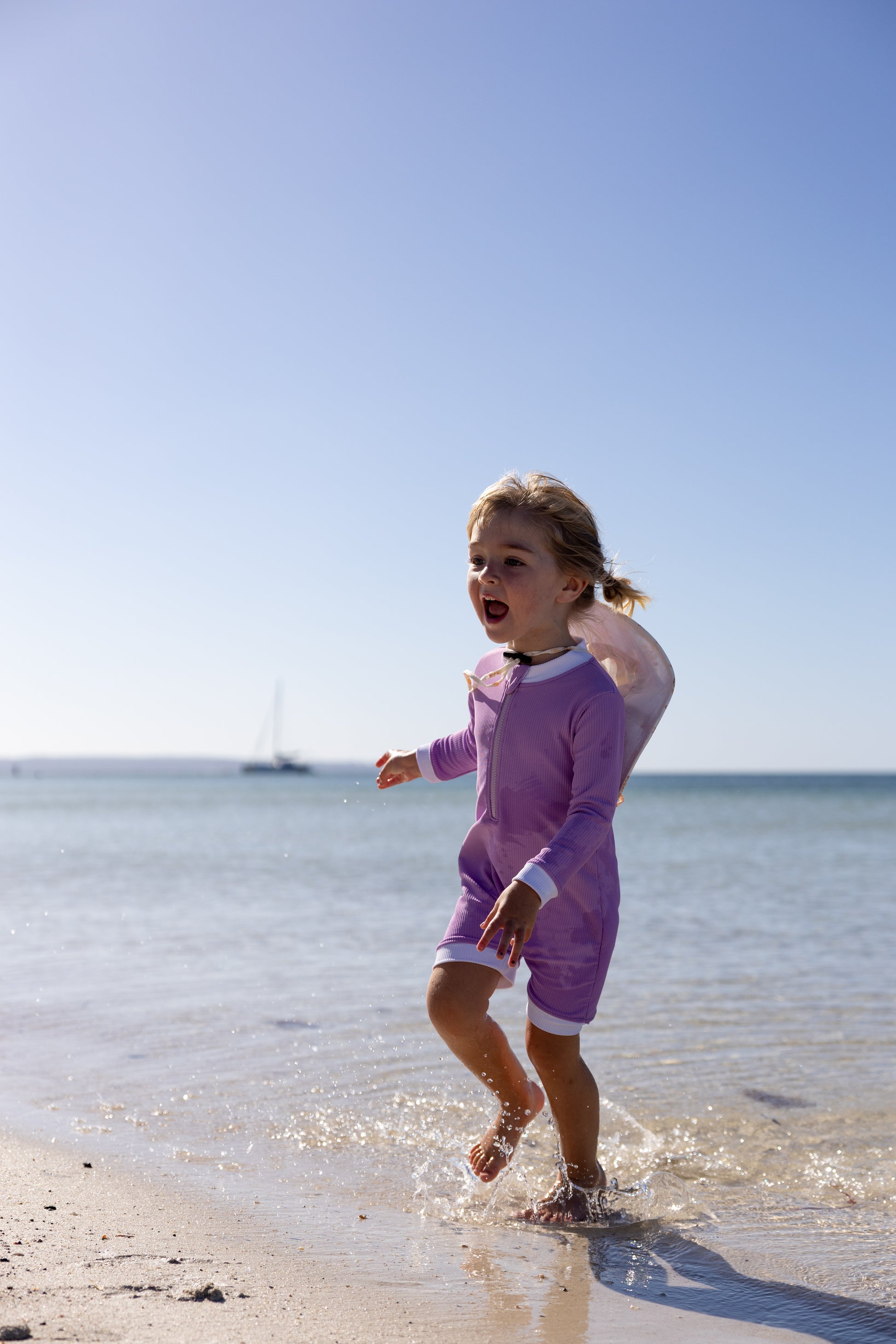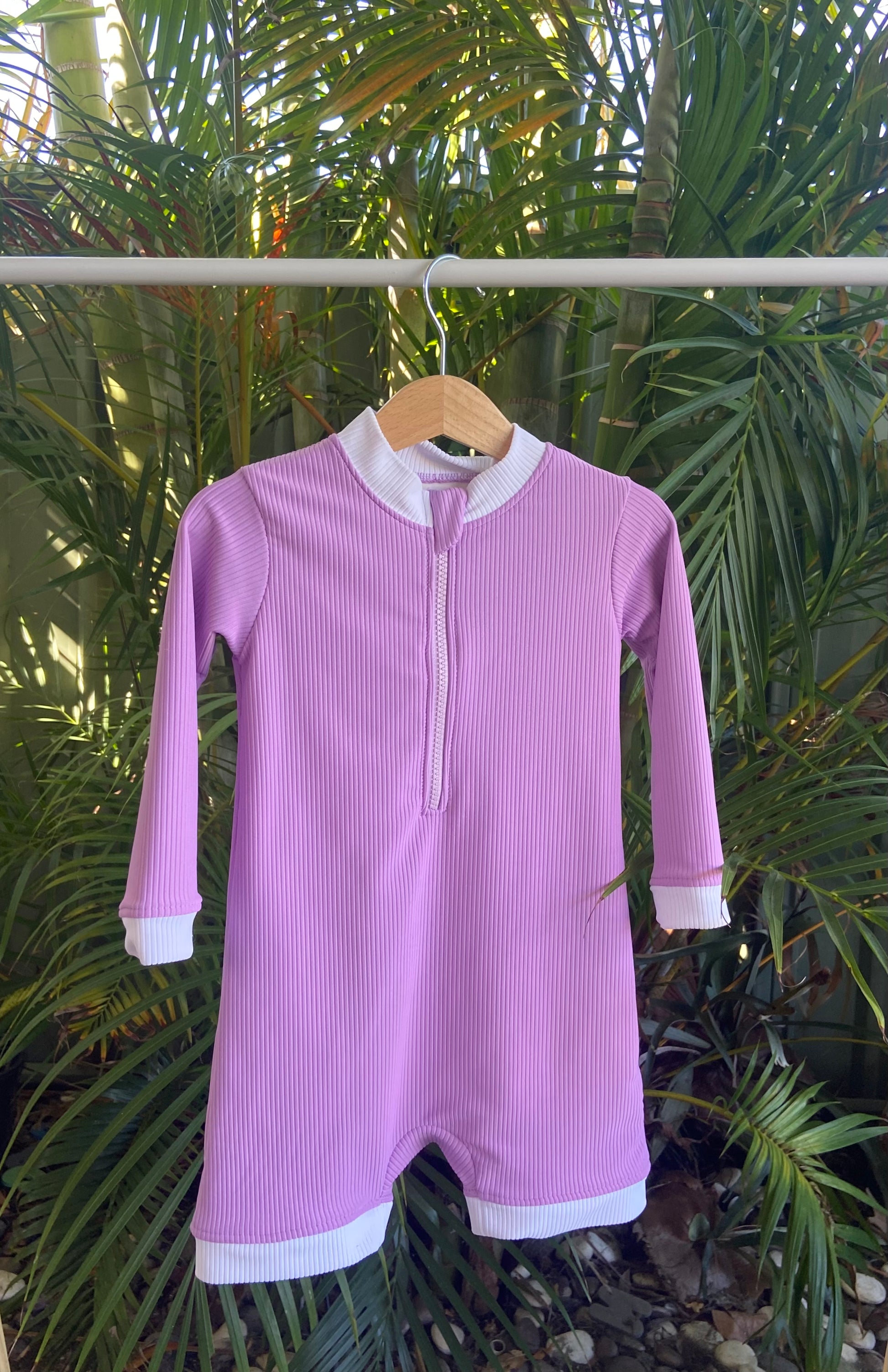 Introducing our eco rib bathers in lilac. These have been made in 87% recycled polyester and 13% spandex and have been double lined so they are super thick and warm! The neck of the bathers has been brought slightly higher to provide more protection from the sun. The long sleeve and slightly longer leg also provides the ultimate sun protection.